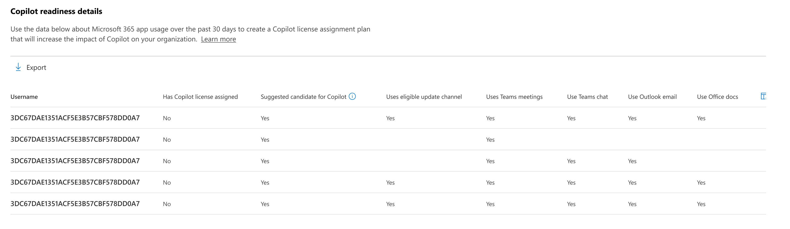 Também pode exportar os dados dos relatórios para um ficheiro Excel .csv, ao selecionar a ligação Exportar. Isto exporta os dados de preparação Microsoft 365 Copilot de todos os utilizadores com qualquer envolvimento em reuniões do Teams, chat do Teams e e-mail do Outlook para documentos do Office nos últimos 30 dias e permite-lhe efetuar uma ordenação, filtragem e pesquisa simples para análise adicional.