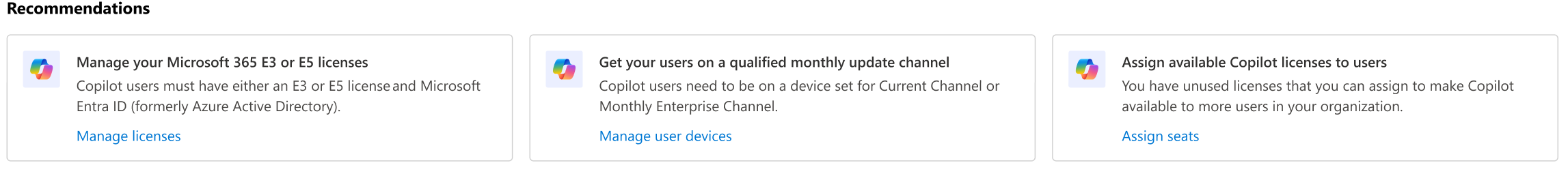 Os cartões de ação recomendados realçam ações importantes a tomar para preparar a sua organização para o Copilot, como mover utilizadores para um canal de atualização de aplicações mensal e atribuir licenças do Copilot disponíveis.