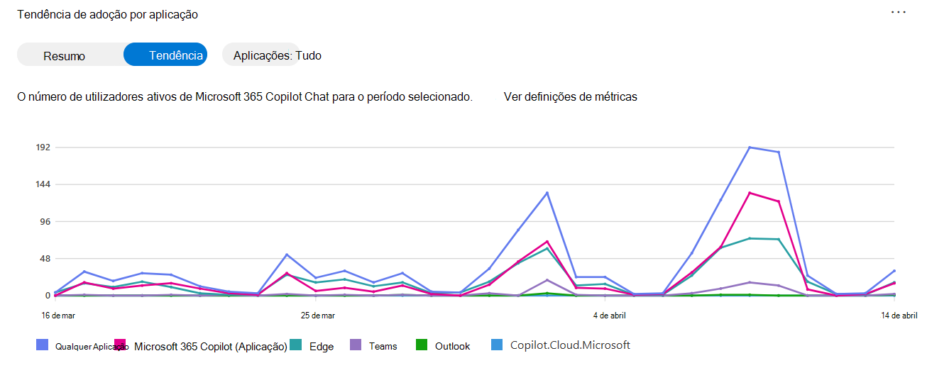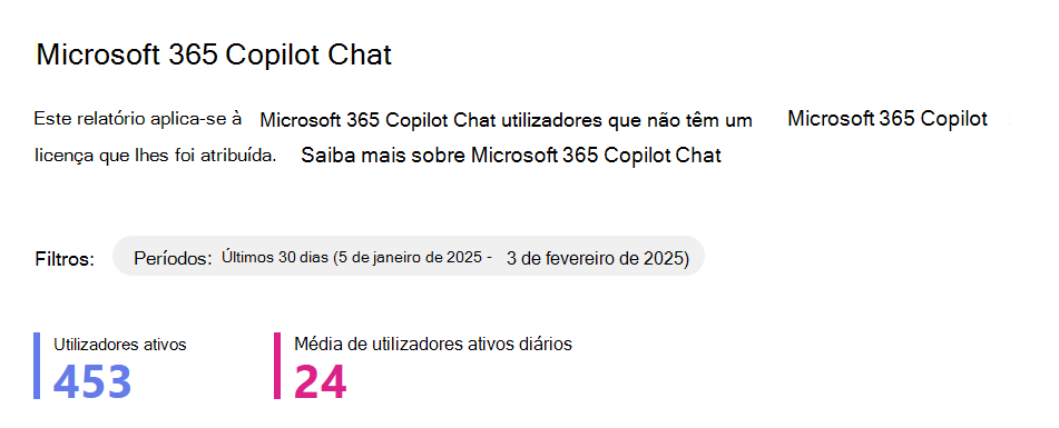 - Os utilizadores ativos diários médios indicam o número médio de pessoas que utilizam Microsoft 365 Copilot Chat por dia durante o período selecionado.