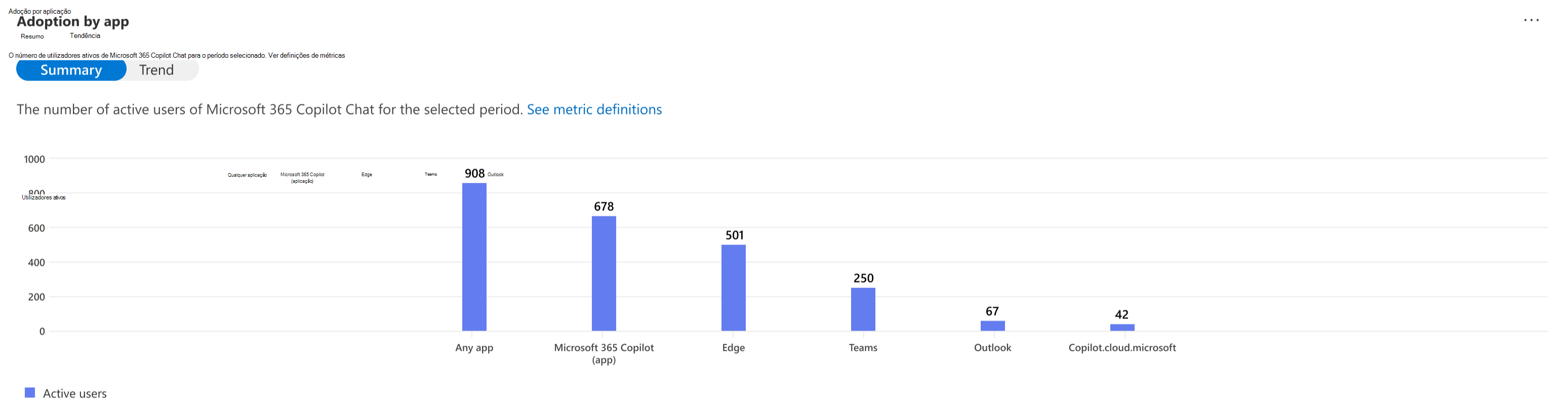 - Os utilizadores ativos mostram o número total de utilizadores que submeteram pelo menos um pedido para Microsoft 365 Copilot Chat durante o período selecionado.