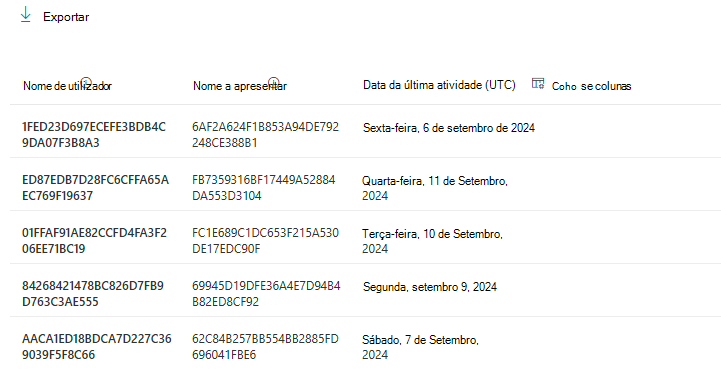 Também pode exportar os dados do relatório para um ficheiro de .csv do Excel ao selecionar a ligação Exportar . Esta ação exporta o Microsoft 365 Copilot Chat dados de utilização de todos os utilizadores e permite-lhe efetuar uma ordenação, filtragem e pesquisa simples para uma análise mais aprofundada.