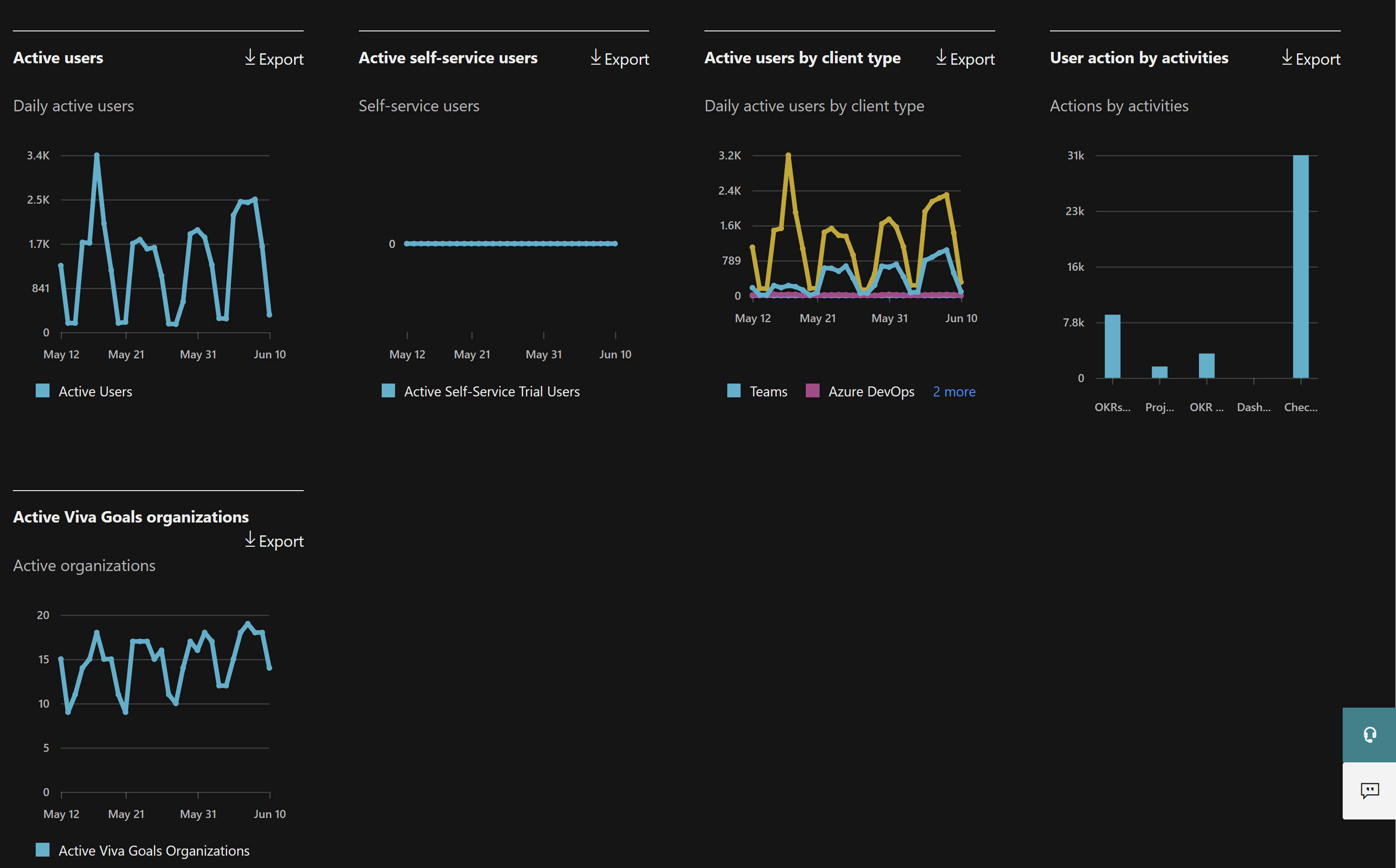 Também pode exportar os dados dos relatórios para um ficheiro Excel .csv, ao selecionar a ligação Exportar. Isto exporta os Viva Goals dados de utilização de todos os utilizadores e permite-lhe efetuar uma ordenação e filtragem simples para uma análise mais aprofundada.