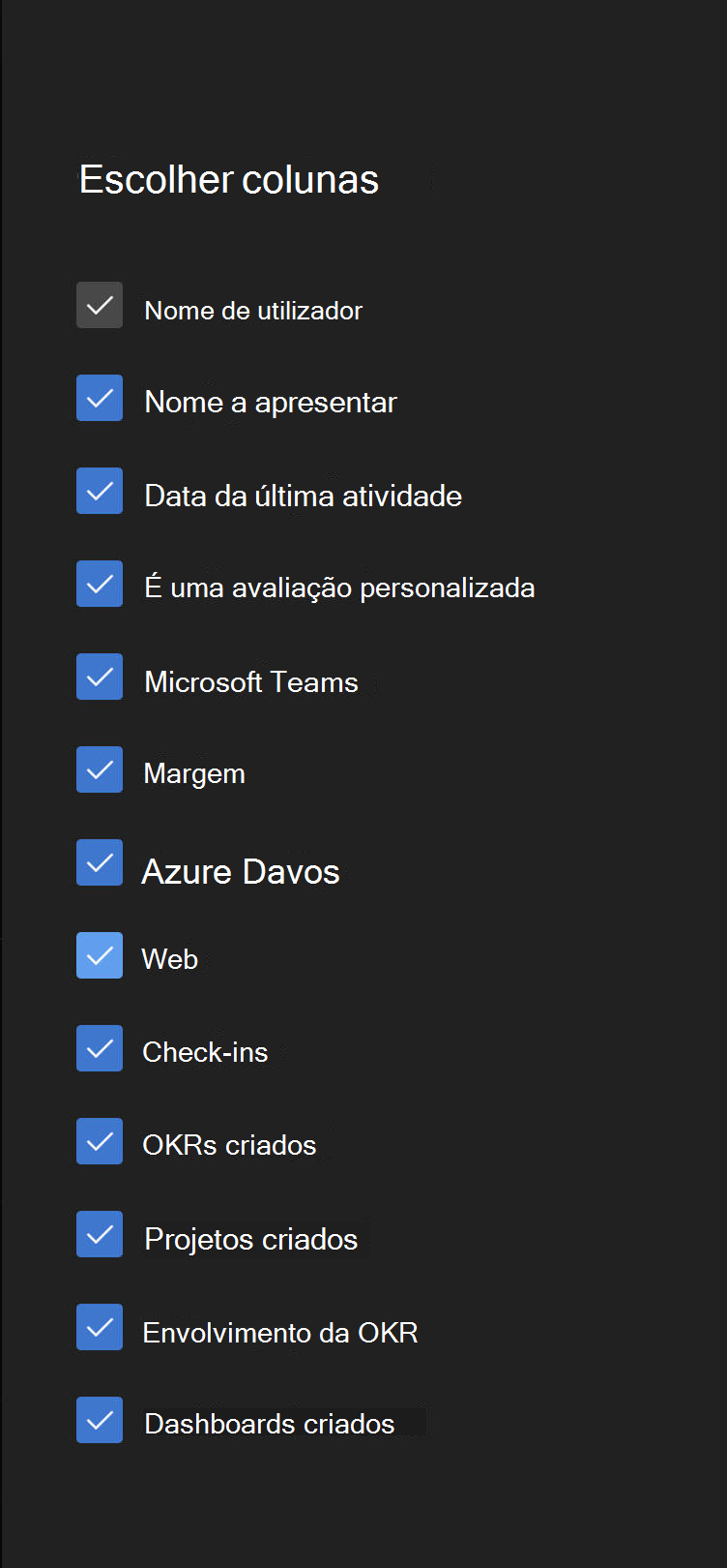 | Azure DevOps | Indica se o utilizador utiliza a integração do Viva Goals no Azure DevOps |