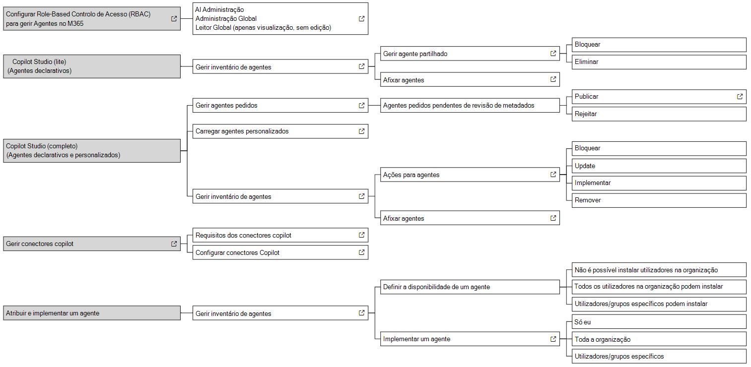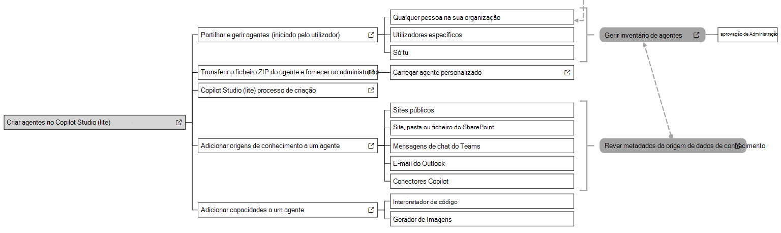 Uma imagem da parte relevante do mapa mental está incluída em cada secção deste artigo. No entanto, para ver todo o mapa mental e aceder às ligações relacionadas, transfira o guia visual Agentes para o PDF do Microsoft 365.