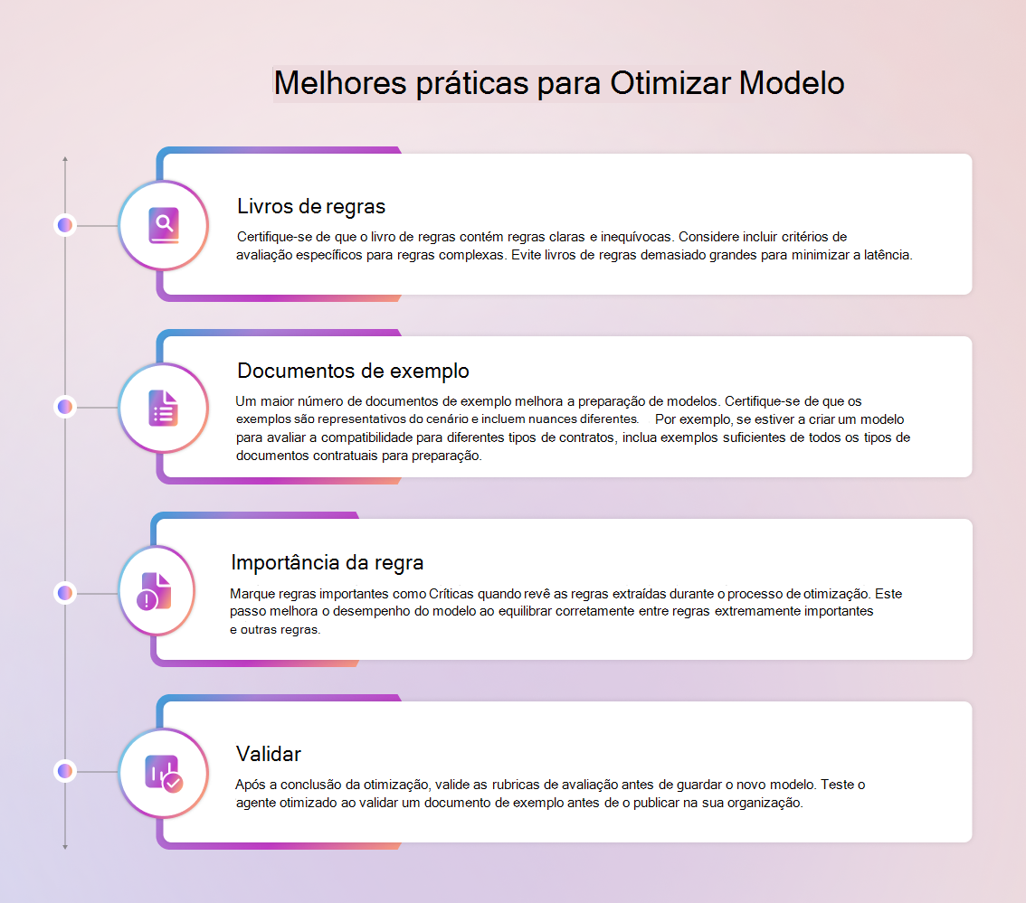 Pode ajustar o modelo do agente de Validação de Documentos para adaptá-lo às necessidades específicas de revisão e conformidade da sua organização. A otimização permite-lhe: