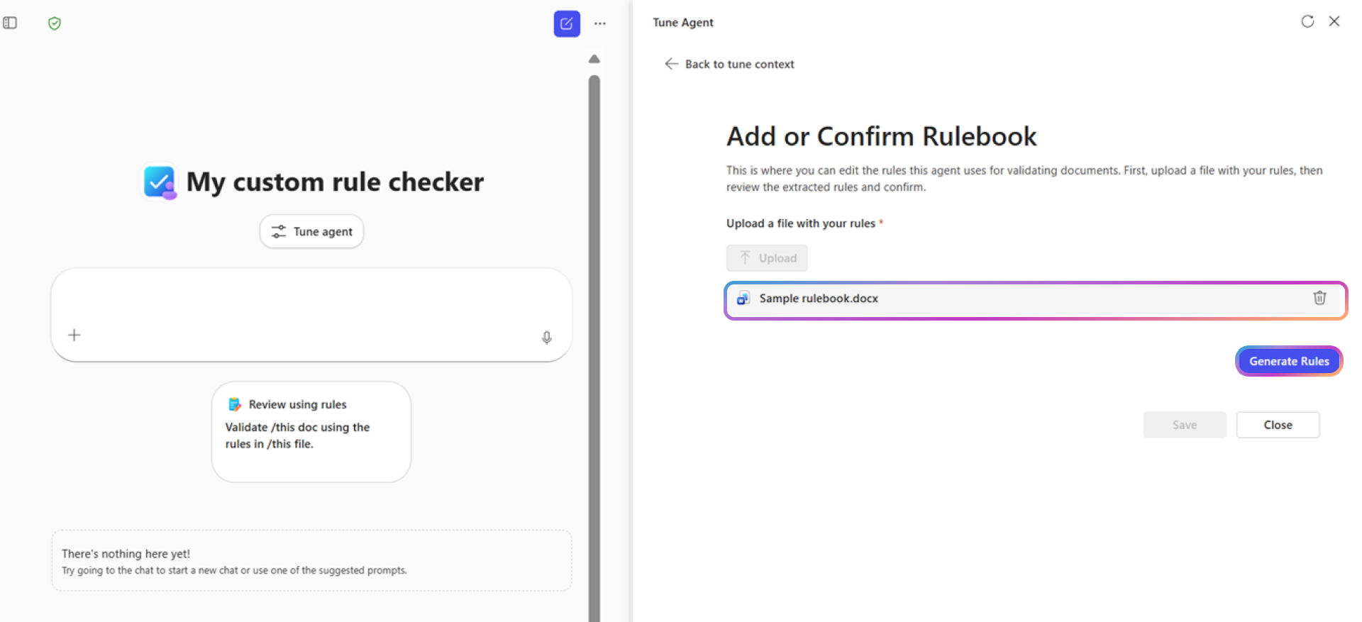 Pode guardar um agente de Validação de Documentos otimizado como um agente especializado e partilhá-lo na sua organização.