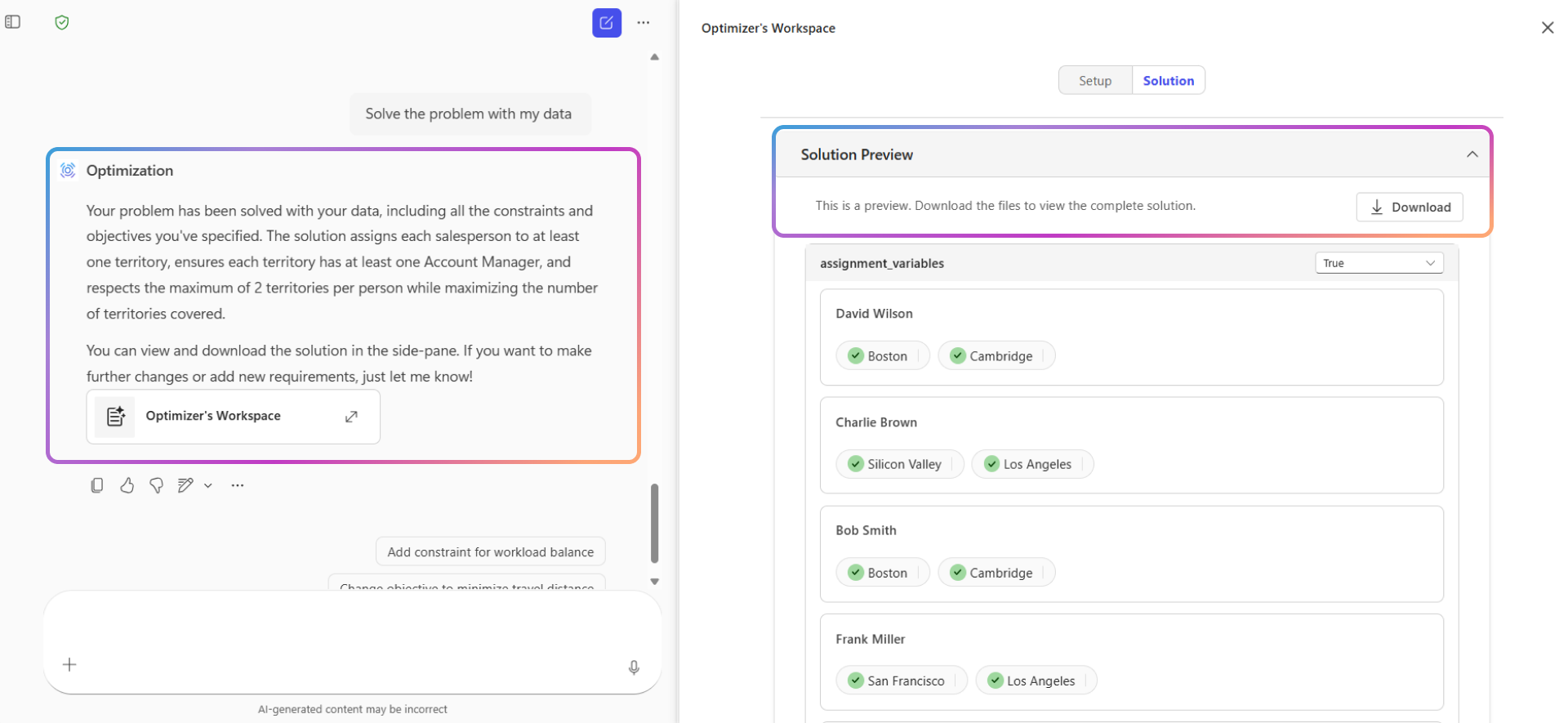 Depois de fornecer estas informações, o agente utiliza as ferramentas do solver para calcular uma solução ideal que satisfaça todas as restrições e objetivos. Apresenta os resultados numa experiência interativa e pode transferi-los como um ficheiro .csv.