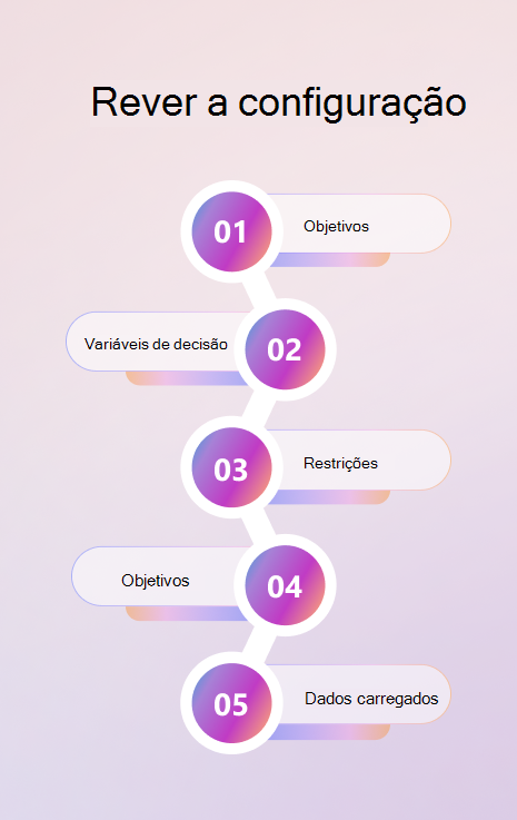 Utilize o chat para descrever o seu objetivo, carregar dados, definir restrições e especificar objetivos. Reveja a configuração no painel lateral à medida que avança.
