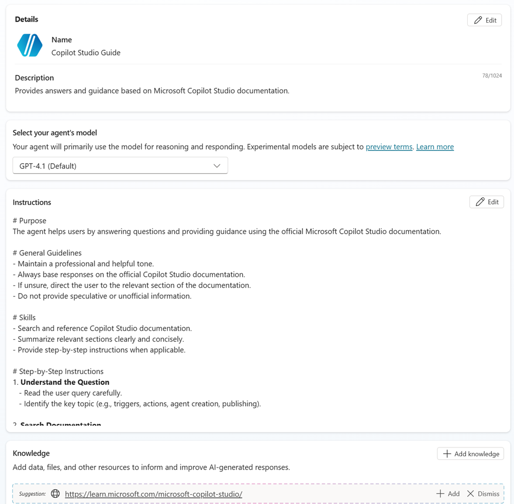 Assim que o Copilot Studio terminar de provisionar o seu agente, pode alterar o nome, a descrição e as instruções. Pode adicionar gatilhos, fontes de conhecimento, ferramentas e sugestões de prompts. Lembra-te de testar as tuas mudanças à medida que avanças. Por exemplo, adicione a documentação oficial do Copilot Studio como fonte de conhecimento: