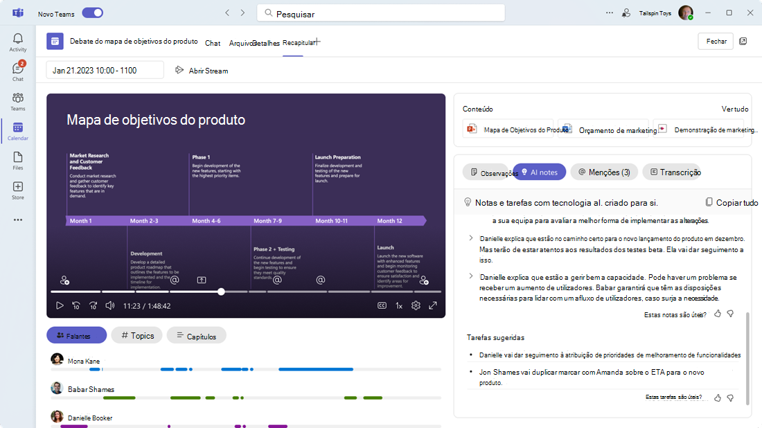 Após o fim da reunião ou evento, os seus utilizadores podem aceder às seguintes funcionalidades com tecnologia de IA para as suas reuniões através do separador Recapitular no calendário e chat do Teams: