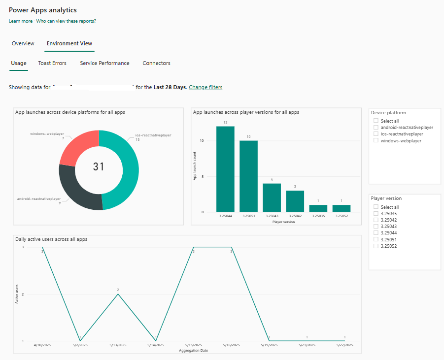 Selecione o ambiente e o período de tempo nas listas pendentes e, em seguida, selecione Aplicar para guardar as alterações. Todos os relatórios de análise do Power Apps refletem agora esta seleção.
