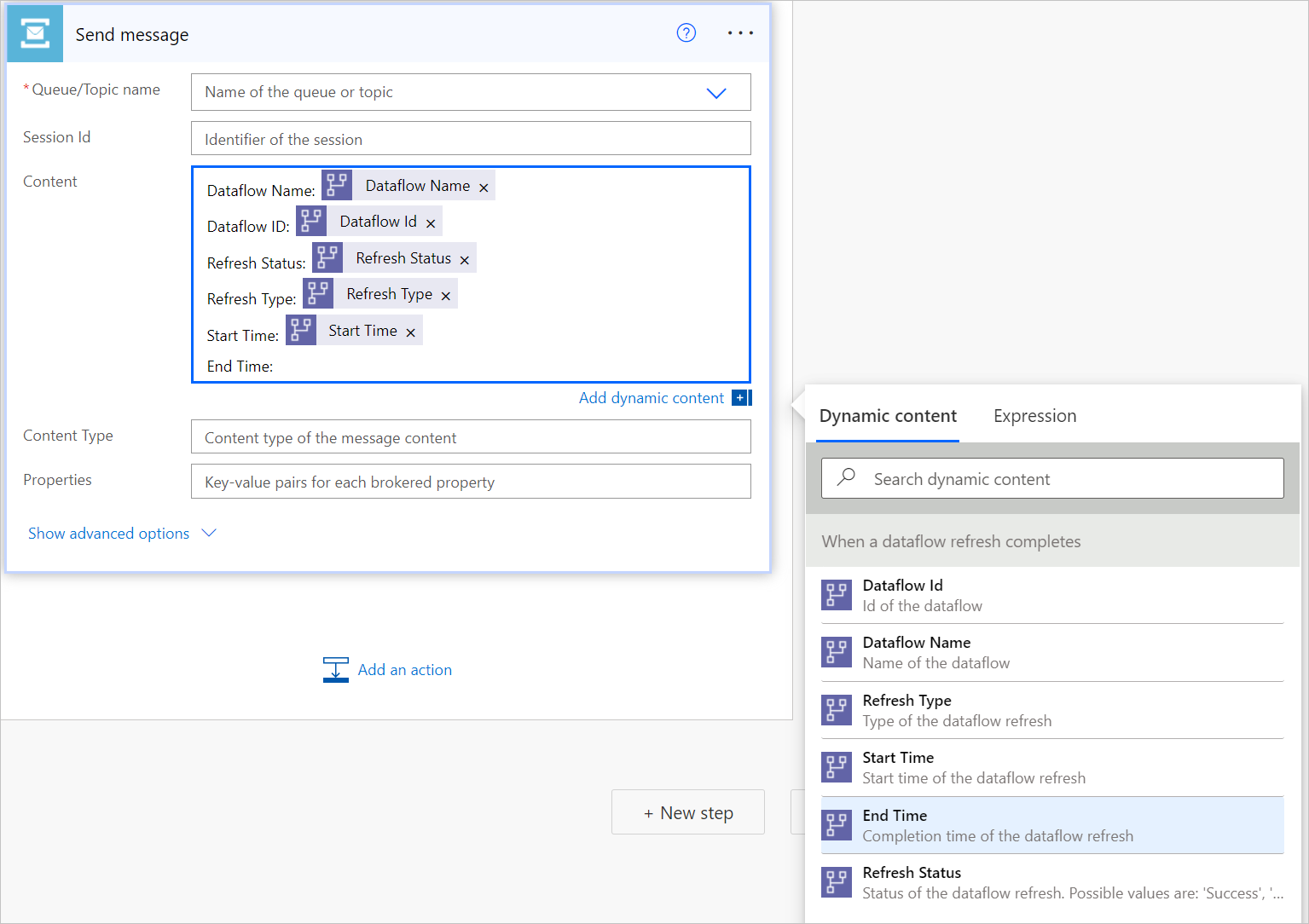 Adicione informações de fluxo de dados ao conteúdo da sua mensagem selecionando o campo próximo a Conteúdo, e depois selecione o conteúdo dinâmico que quer usar em Conteúdo Dinâmico.