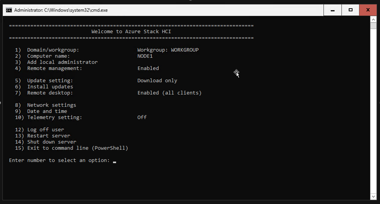 From the Welcome to Azure Stack HCI window (SConfig tool), you can perform these initial configuration tasks on each server: