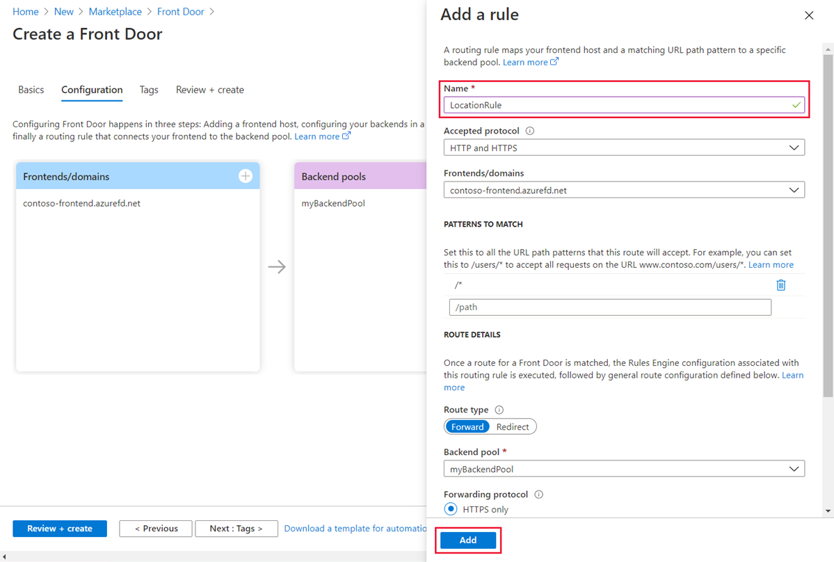 Em Adicionar uma regra, em Nome, digite LocationRule. Mantenha todos os valores padrão e selecione Adicionar para criar a regra de roteamento."