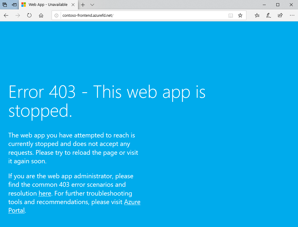 Depois de criar uma porta frontal, leva alguns minutos para que a configuração seja implantada globalmente. Após a implantação, acesse o host frontend que você criou navegando até seu endereço no navegador. Suas solicitações são automaticamente roteadas para o servidor mais próximo a partir dos servidores especificados no pool de back-end.
