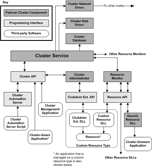| Resource Monitors (one or more ) | Provides a communication, monitoring, and processing layer between the Cluster service and resources |