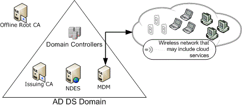 In this design, there is no isolation for the server running the Network Device Enrollment Service and it is a member of the internal domain. The mobile device management software must authenticate all the requests for certificates from the wireless network. For example, this authentication might be to prompt for user name and password. See the following diagram for an example of this deployment design.