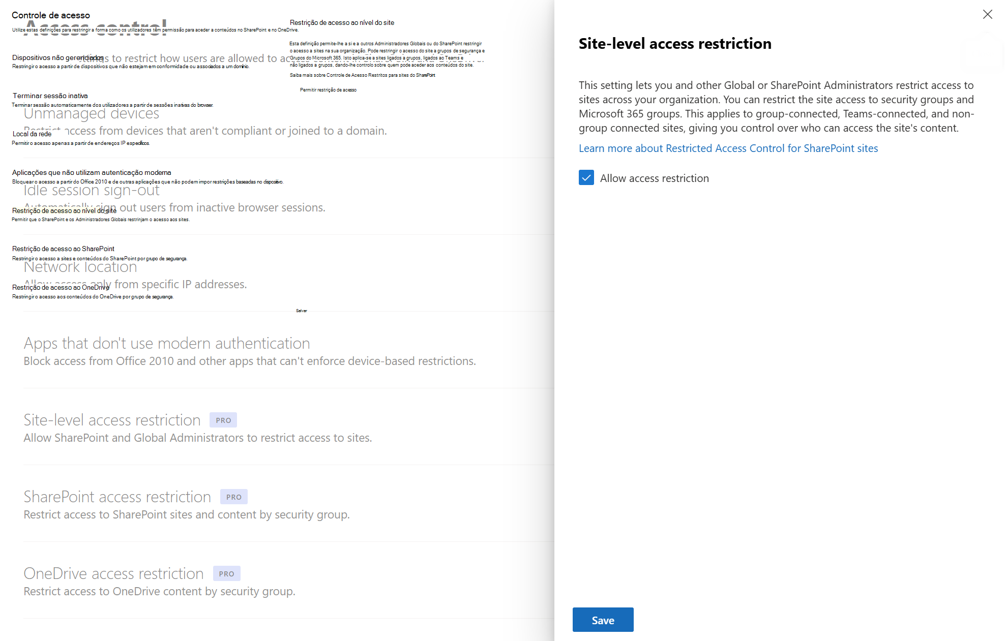 A partilha de sites do SharePoint e respetivos conteúdos não honra a política de acesso restrito ao site por predefinição. O administrador do SharePoint pode optar por restringir a partilha do site e o respetivo conteúdo com utilizadores que não sejam membros do grupo Controle de Acesso Restrito.