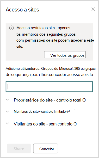 A partilha de um site e o respetivo conteúdo não é permitida para os grupos de segurança aninhados que fazem parte dos grupos de Controle de Acesso Restritos. Este suporte será adicionado na próxima iteração de versão.