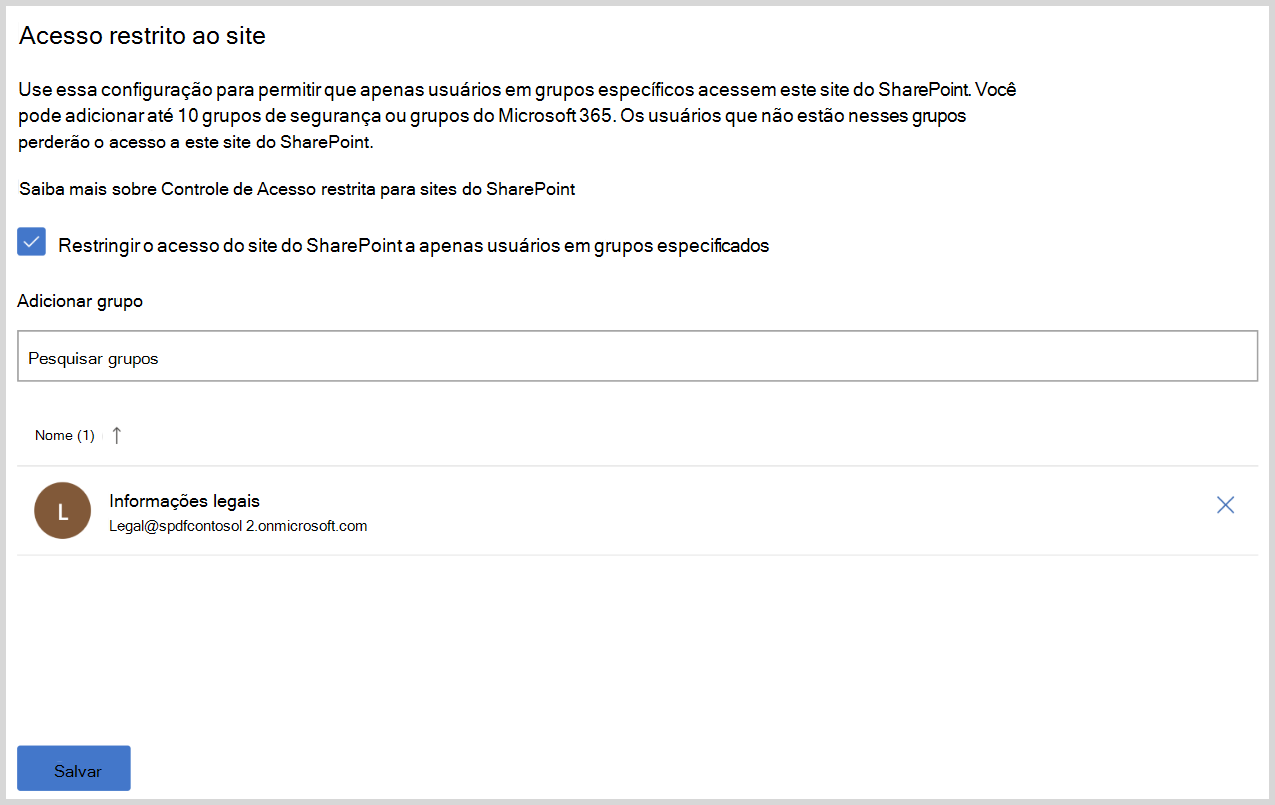 Pode restringir o acesso a um site do SharePoint ao especificar Microsoft Entra grupos de segurança ou grupos do Microsoft 365 como o grupo Controle de Acesso Restrito. O grupo de controlo deve ter os utilizadores a quem deve ser permitido o acesso ao site e ao respetivo conteúdo.