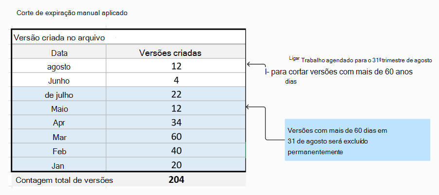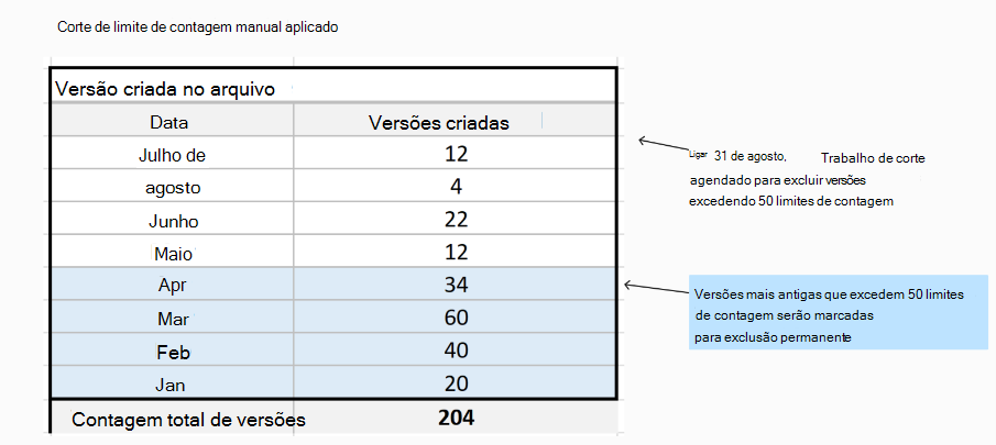 Exemplo: No exemplo seguinte, uma tarefa de corte é colocada em fila para eliminar versões que excedam 50 contagens de versões principais. No dia 31 de agosto, a tarefa começa a eliminar permanentemente versões mais antigas que excedem o limite de 50 versões principais a partir de 31 de agosto.