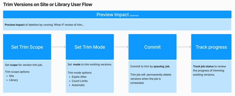 Enquanto administrador do SharePoint no Microsoft 365, pode colocar uma tarefa em fila para cortar versões existentes num site, biblioteca ou conta de utilizador do OneDrive para reduzir o espaço de armazenamento da versão do seu site. Também pode alinhar o armazenamento de versões existente com os limites do histórico de versões atualizados ao agendar uma tarefa para cortar versões existentes ou alinhar o armazenamento de versões existente com os limites atualizados do Histórico de versões.