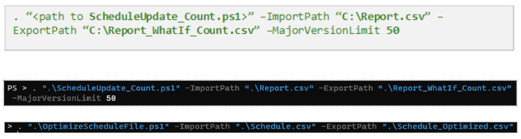 Eis um exemplo de script do PowerShell para gerar um ficheiro de relatório What-If. Aplica uma política Manual com Limites de Contagem com o limite de versões principal definido como 50 no ficheiro C:\Report.csvde relatório .
