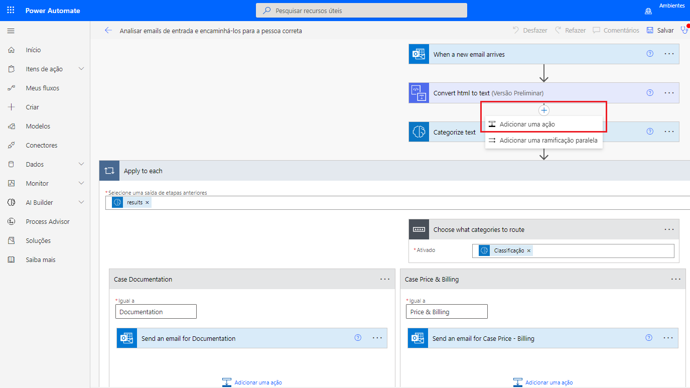 Você será redirecionado para o editor de fluxo da nuvem com um novo fluxo criado com base no modelo selecionado. Você criará esse modelo usando o modelo de Classificação de Categoria predefinido, que fornece uma base para este exercício. Você modificará o modelo para integrar o modelo personalizado. Após a ação Converter html em texto, selecione Adicionar uma ação.