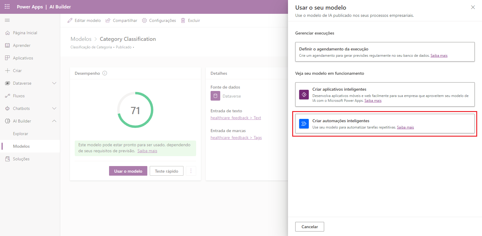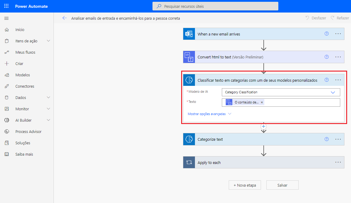 Exercício: criar um modelo de classificação de categoria personalizado e usá-lo no Power Automate