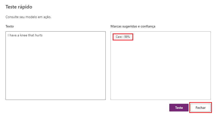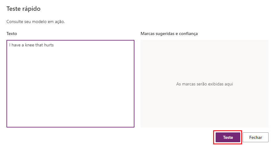Envie qualquer valor de texto que permita determinar se o modelo foi executado conforme o esperado e, em seguida, selecione Testar.