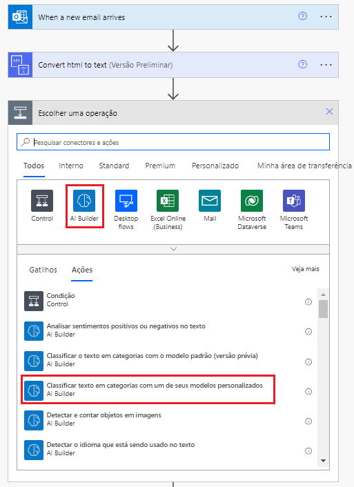 Selecione o conector do AI Builder e, na lista de ações, selecione Classificar texto em categorias com um de seus modelos personalizados.