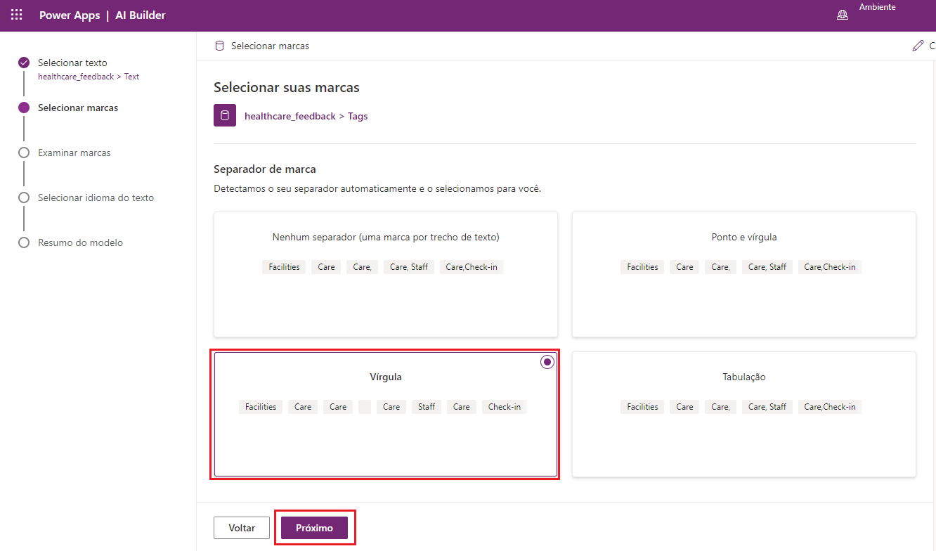 Examine as diferentes opções de separador de marcas, selecione Vírgula e, depois, Avançar.