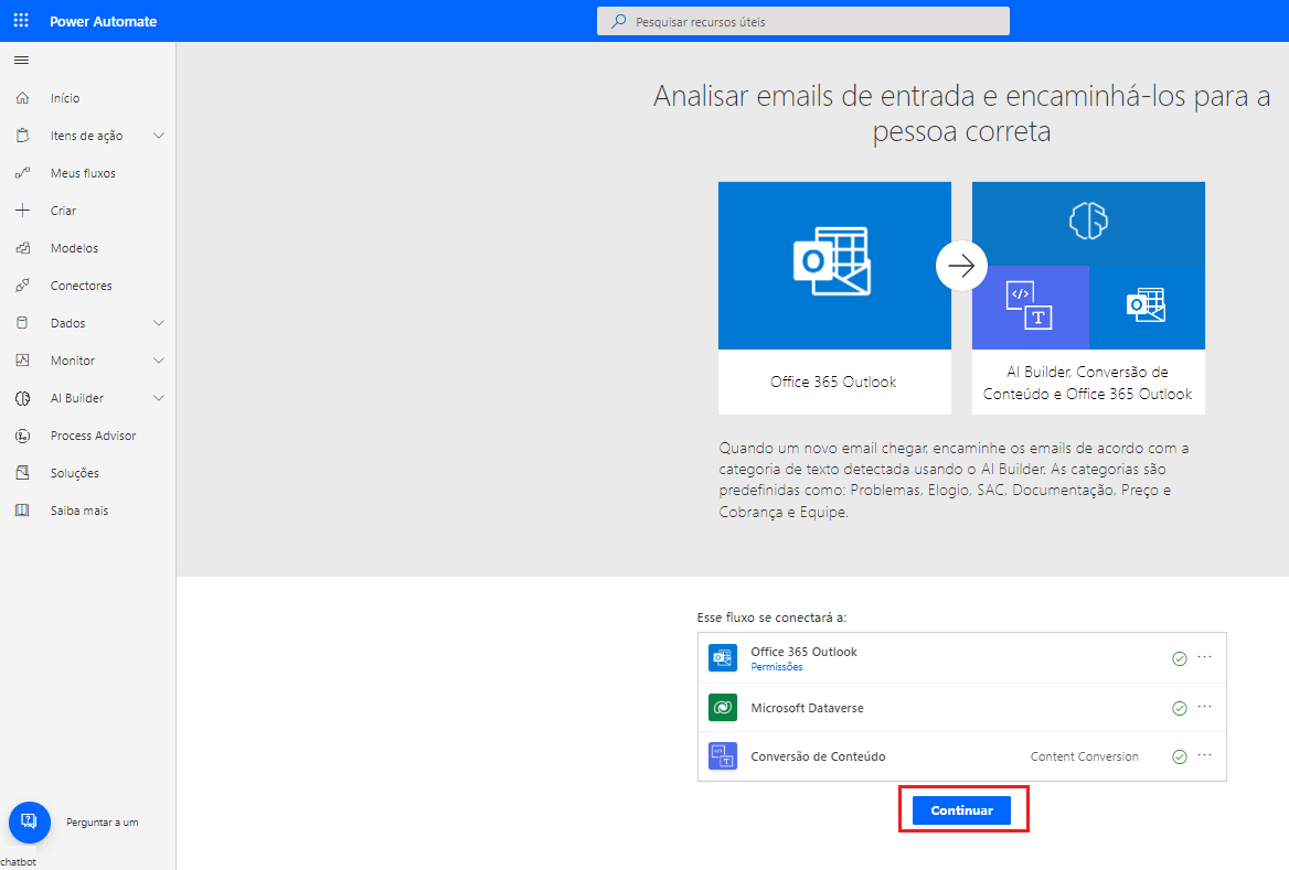 Você será redirecionado para uma apresentação do modelo. Depois de validar as conexões necessárias, selecione Continuar.
