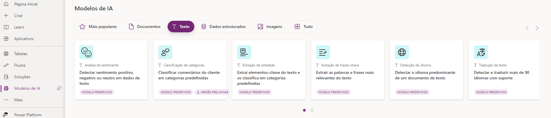 No Microsoft Power Apps Studio, no menu de navegação esquerdo, em Hub de IA e, depois, em Modelos de IA, selecione Texto nos filtros na parte superior e selecione Classificação de Categoria (Modelo personalizado).