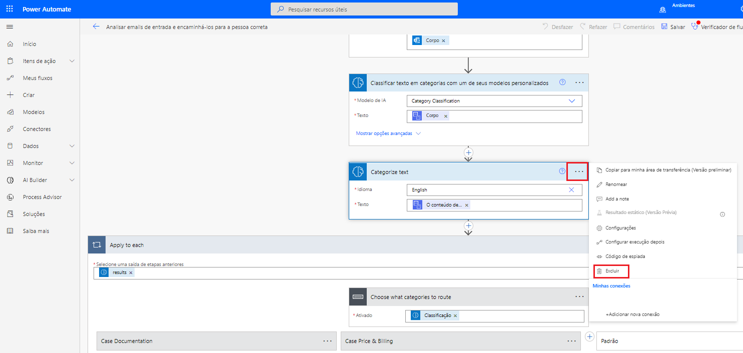 Exclua a ação Categorizar texto.