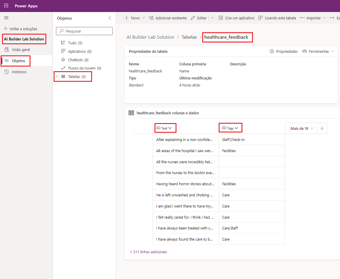 Para este exercício, você fará referência à tabela healthcare_feedback que faz parte da solução Laboratório do AI Builder. Ela contém mais de 500 registros de comentários de pacientes marcados com uma ou mais das seguintes palavras-chave de categoria: