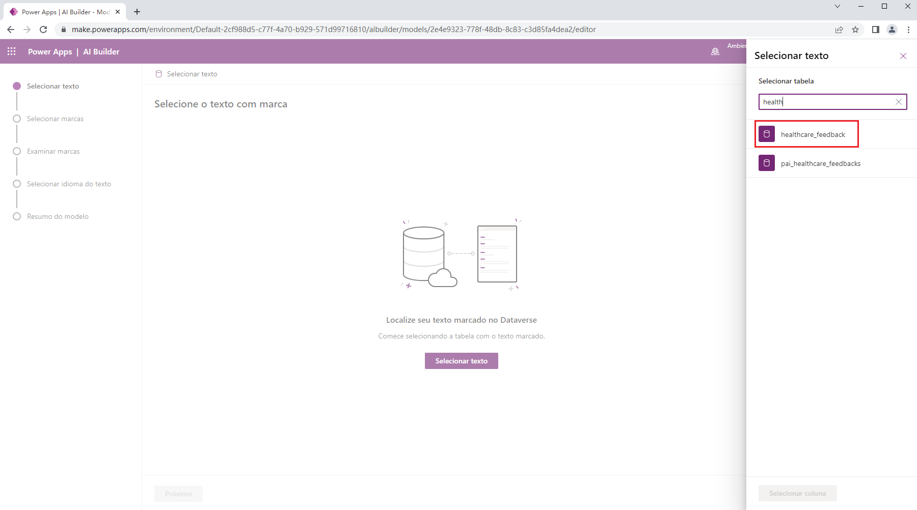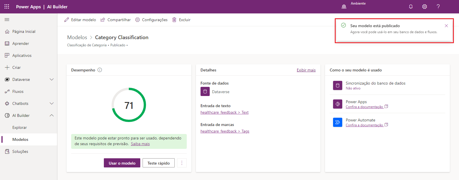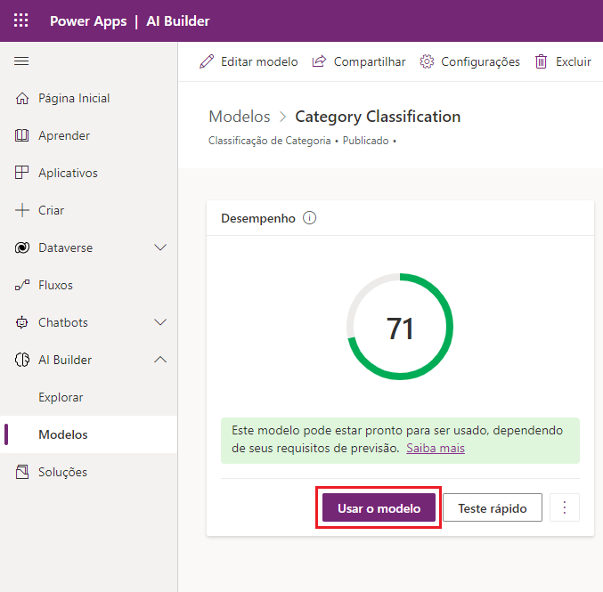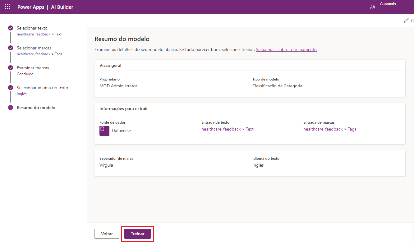 Depois de selecionar as colunas que contêm o texto e as marcas relacionadas para classificação de categoria, você precisará treinar o modelo personalizado para que ele possa ser usado no Power Apps ou no Power Automate.