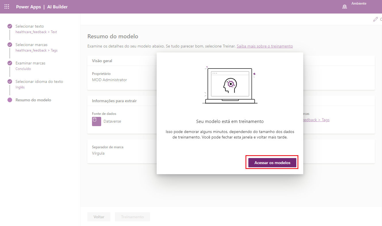 Depois de selecionar Treinar na última etapa da parte anterior deste exercício, selecione Ir para modelos.