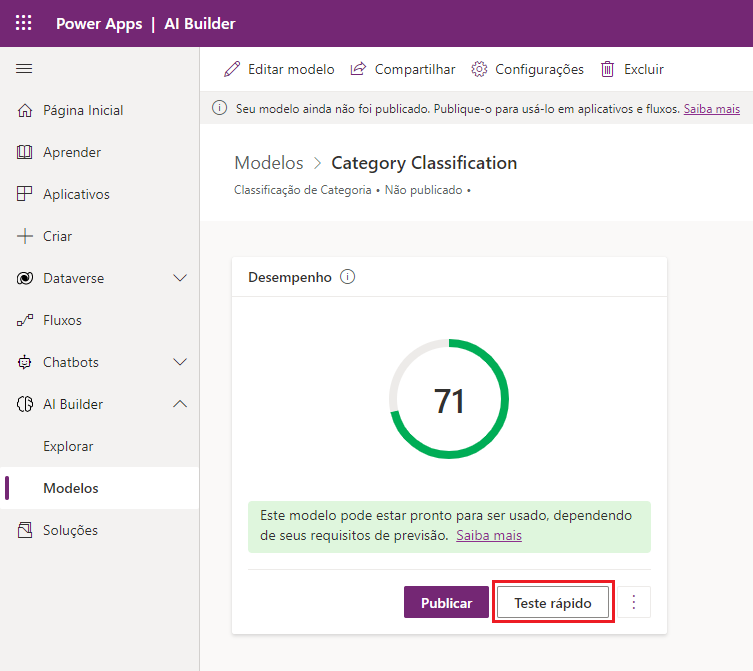 Confirme o desempenho do modelo selecionando Teste rápido.