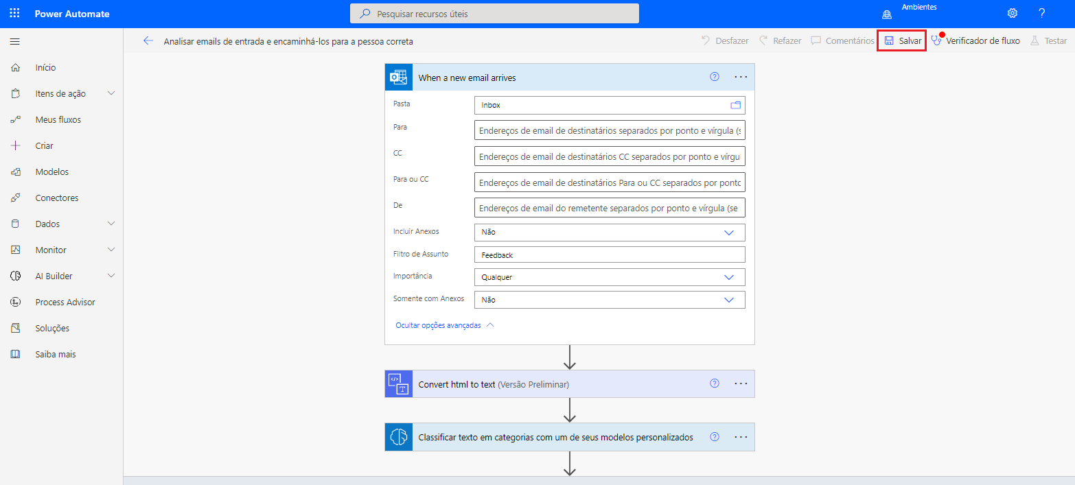 Neste exercício, se a conta monitorada (endereço de email) for a mesma para a qual os resultados são enviados, será preferível adicionar um Filtro de Assunto no gatilho Quando um novo email é recebido para que o fluxo não seja disparado indefinidamente.
