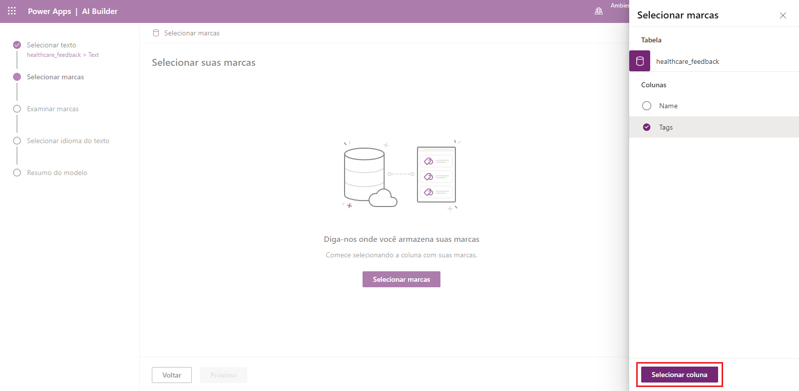 Examine o texto marcado para a coluna selecionada e selecione Avançar.