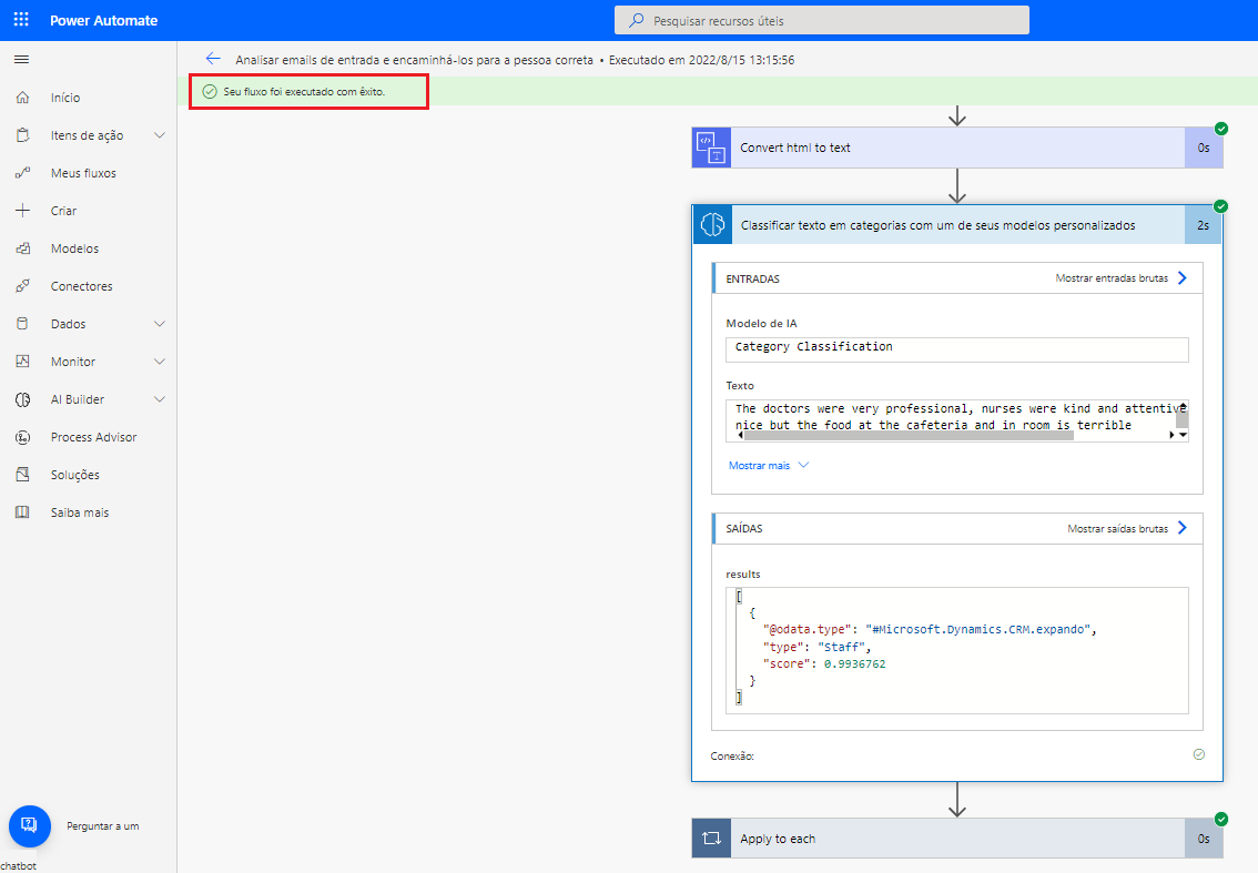 Você criou com sucesso um modelo do AI Builder de classificação de categoria personalizado e o integrou em um fluxo do Power Automate.