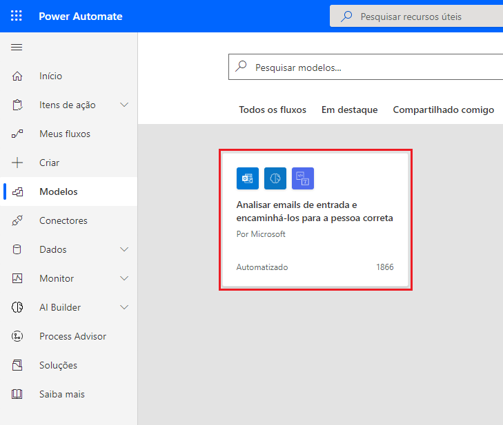 Você será redirecionado para uma nova guia do navegador no Power Automate Studio, com um modelo que corresponde ao cenário deste exercício. Selecione o bloco Analisar emails de entrada e encaminhá-los para a pessoa correta.