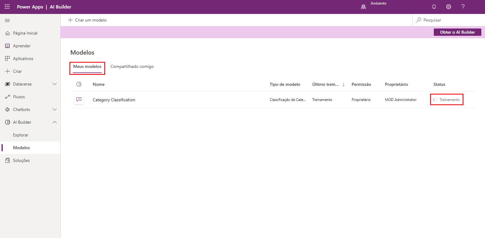 Na lista de modelos do AI Builder, em Meus modelos, identifique seu modelo recém-criado que está em Treinamento.