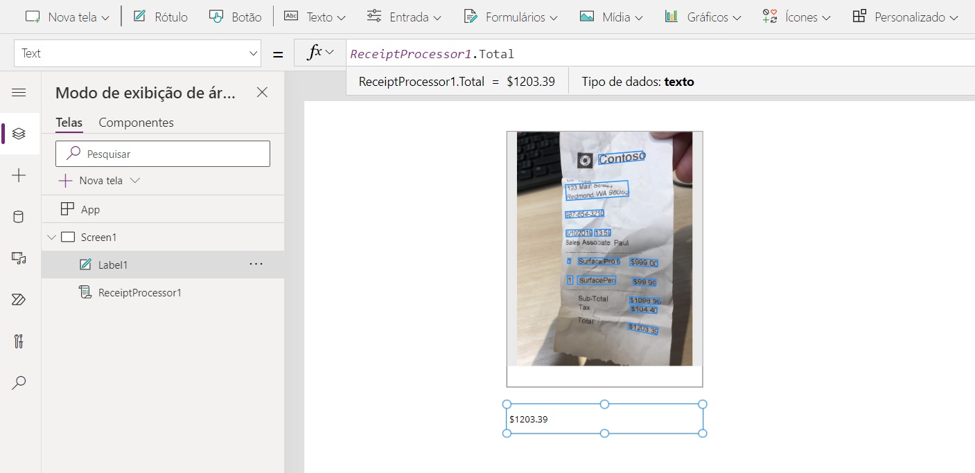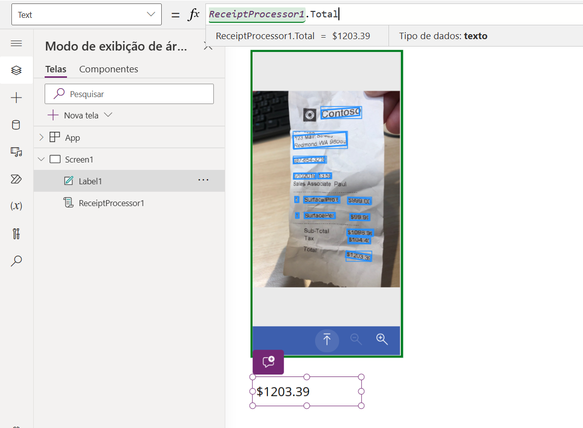 Depois de selecionar o componente de rótulo recém-criado, defina sua propriedade Text usando a barra de fórmulas para a propriedade Total do componente Processador de recibos.