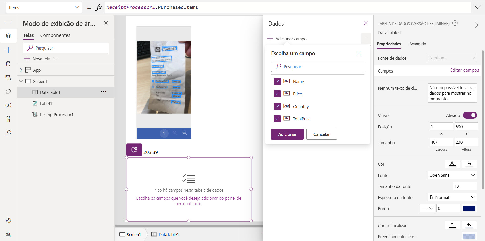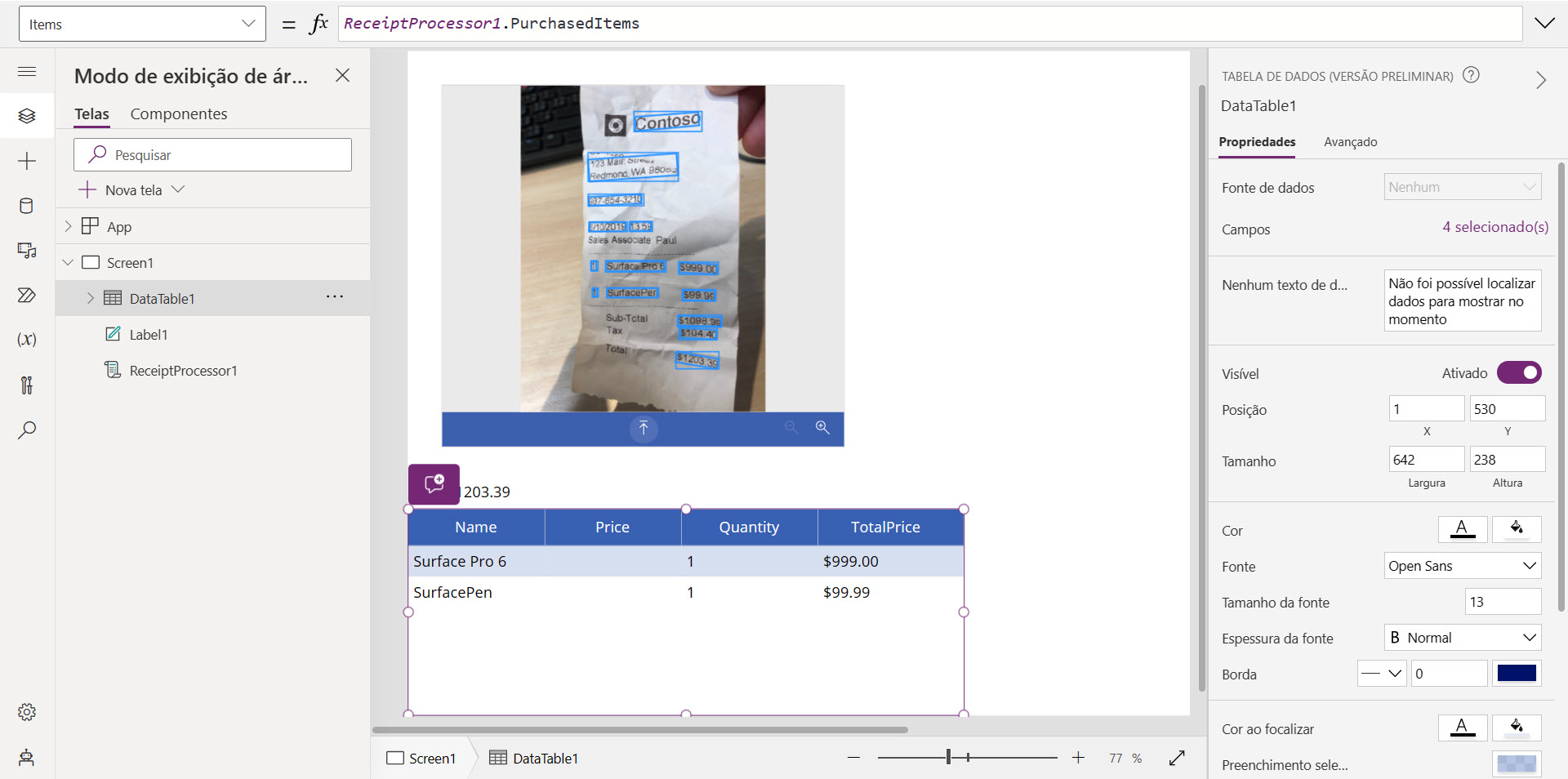 Depois de selecionar o componente de rótulo de dados recém-criado, defina sua propriedade Items usando a barra de fórmulas para a propriedade PurchasedItems do componente Processador de recibos.