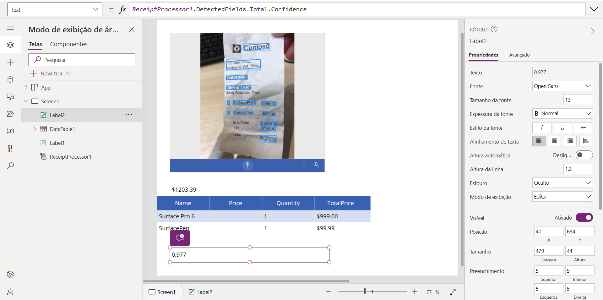 Depois de selecionar o componente de rótulo recém-criado, defina sua propriedade Text usando a barra de fórmulas para a propriedade DetectedFields.Total.Confidence do componente Processador de recibos.