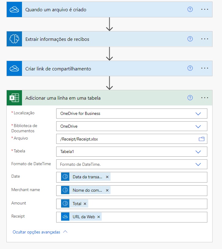 Neste exercício, você criará um fluxo que será executado automaticamente sempre que um novo arquivo for adicionado à pasta do OneDrive for Business. Esse fluxo verificará a imagem em busca das principais informações do recibo e as gravará em uma planilha do Microsoft Excel.
