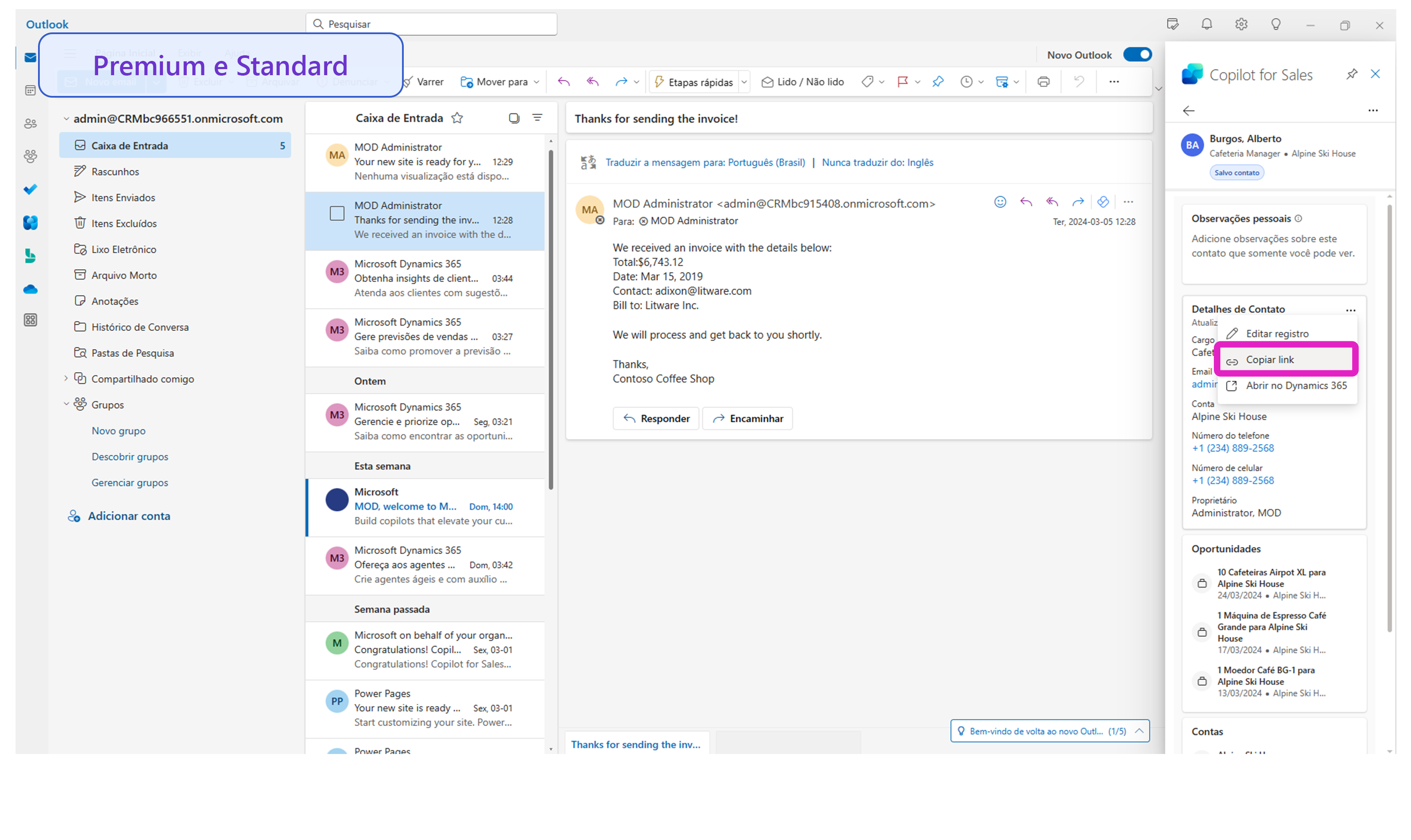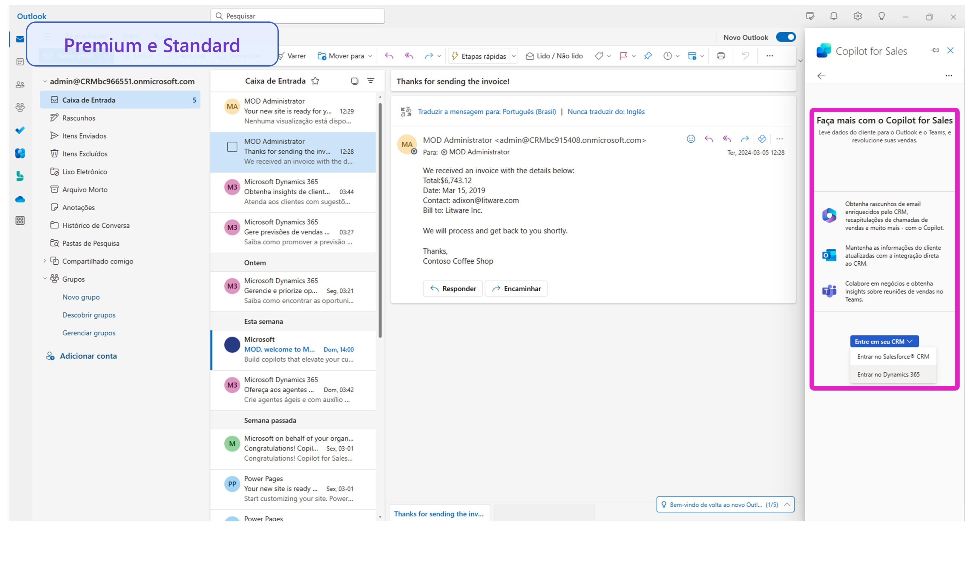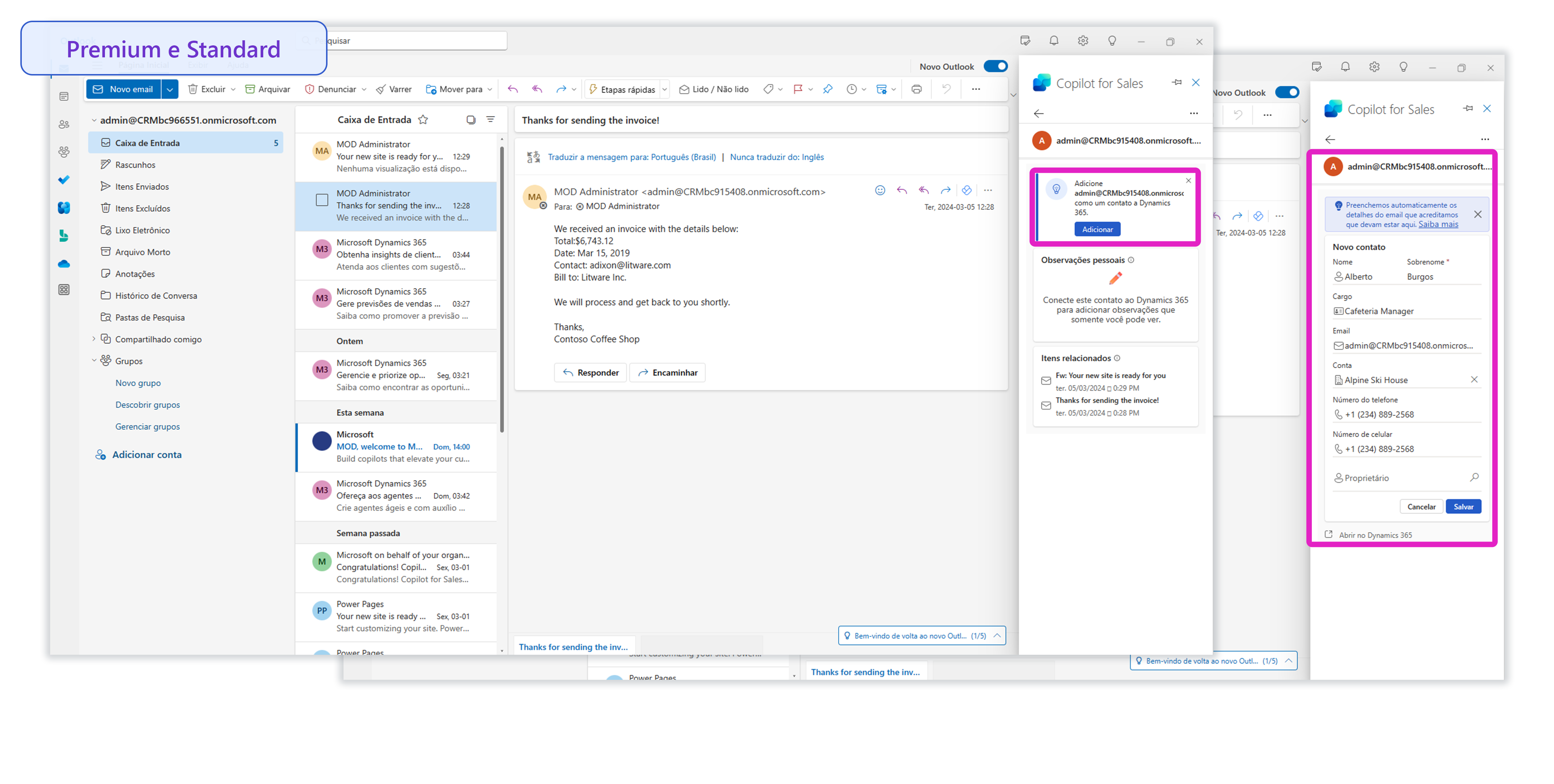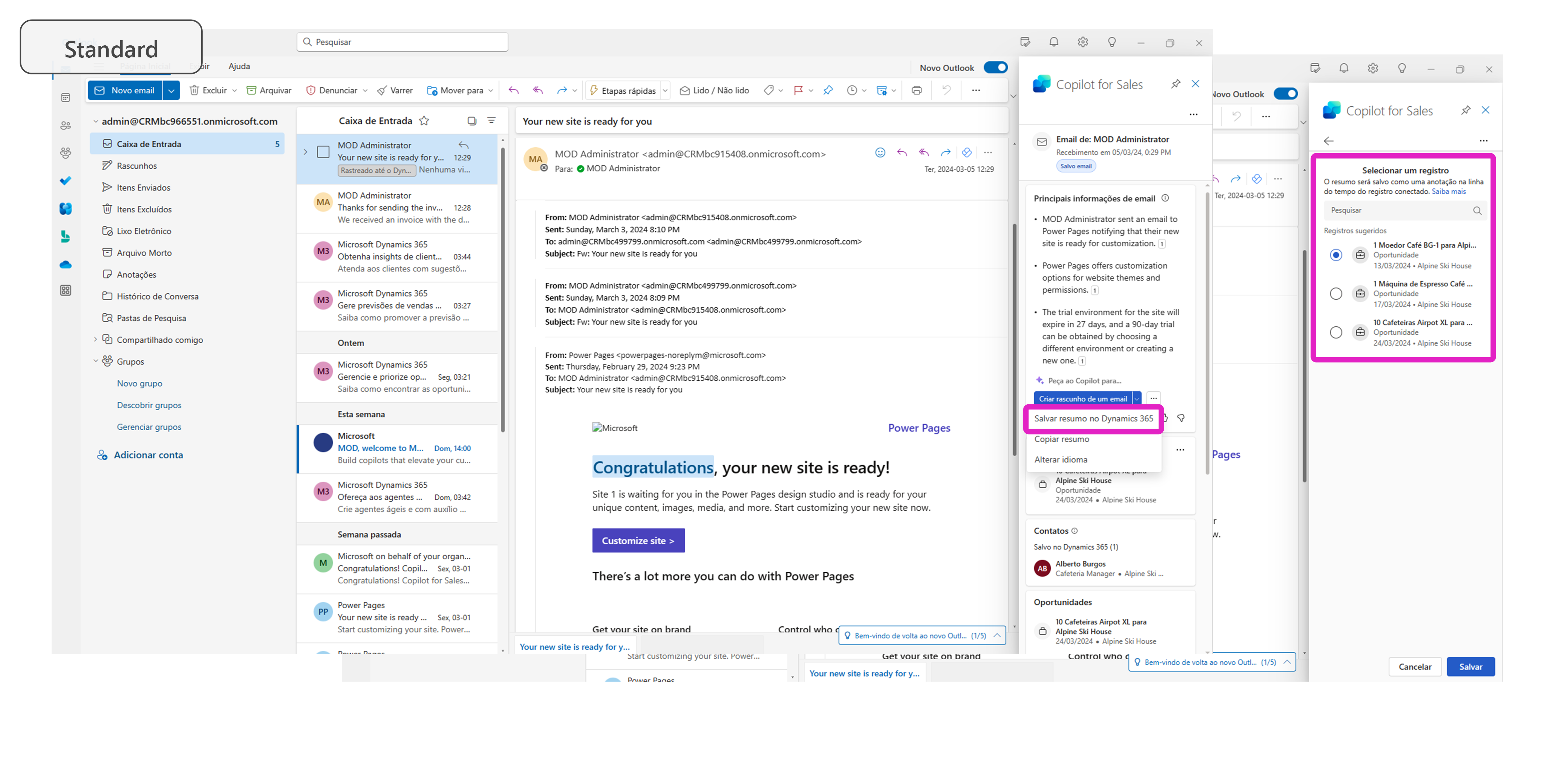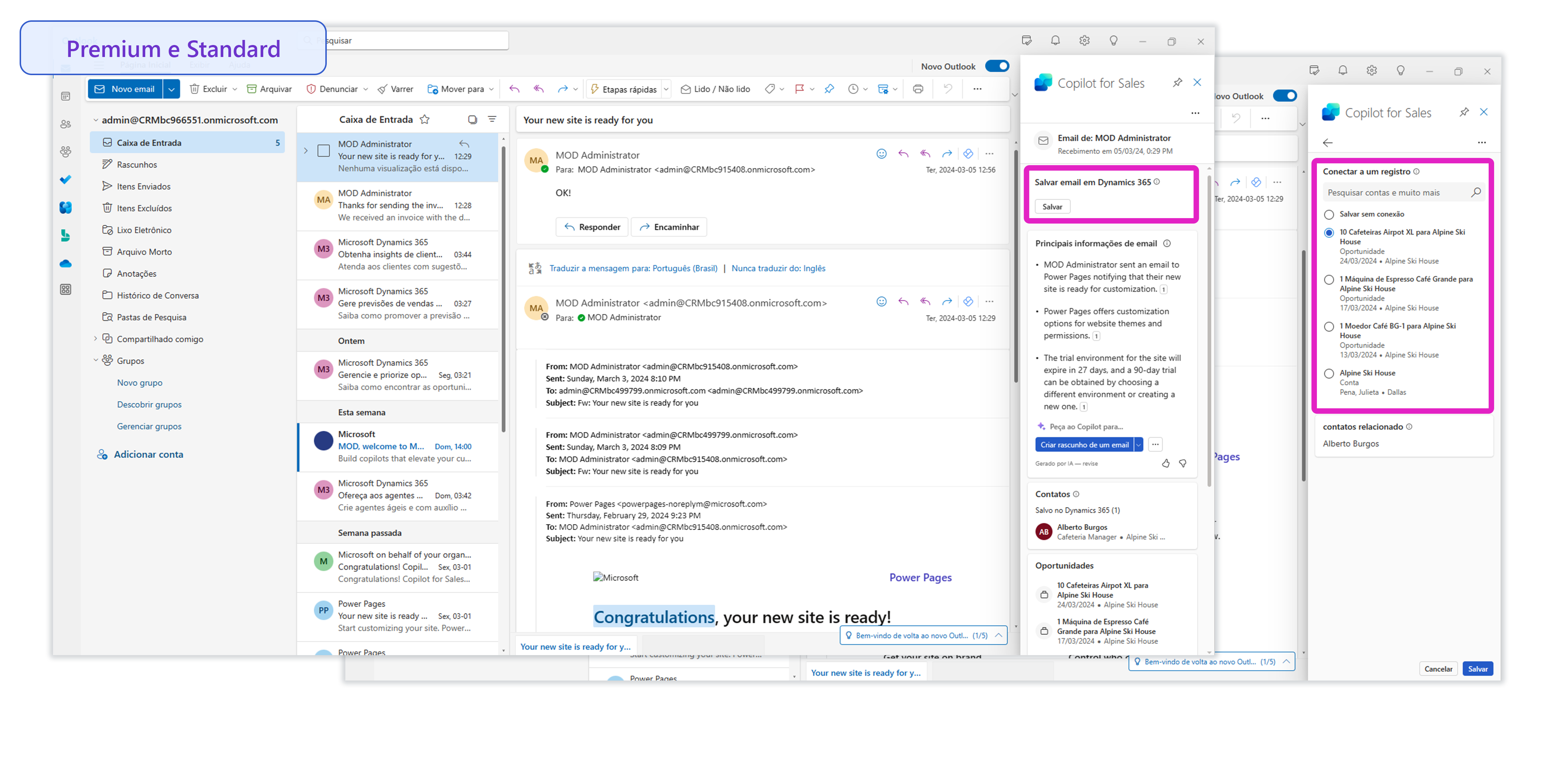 Salvar emails e atividades: com o Microsoft 365 Copilot para Vendas, você pode salvar tópicos de email e reuniões em seu aplicativo de CRM e conectá-los aos registros de CRM para que sua organização de vendas tenha as informações mais recentes.