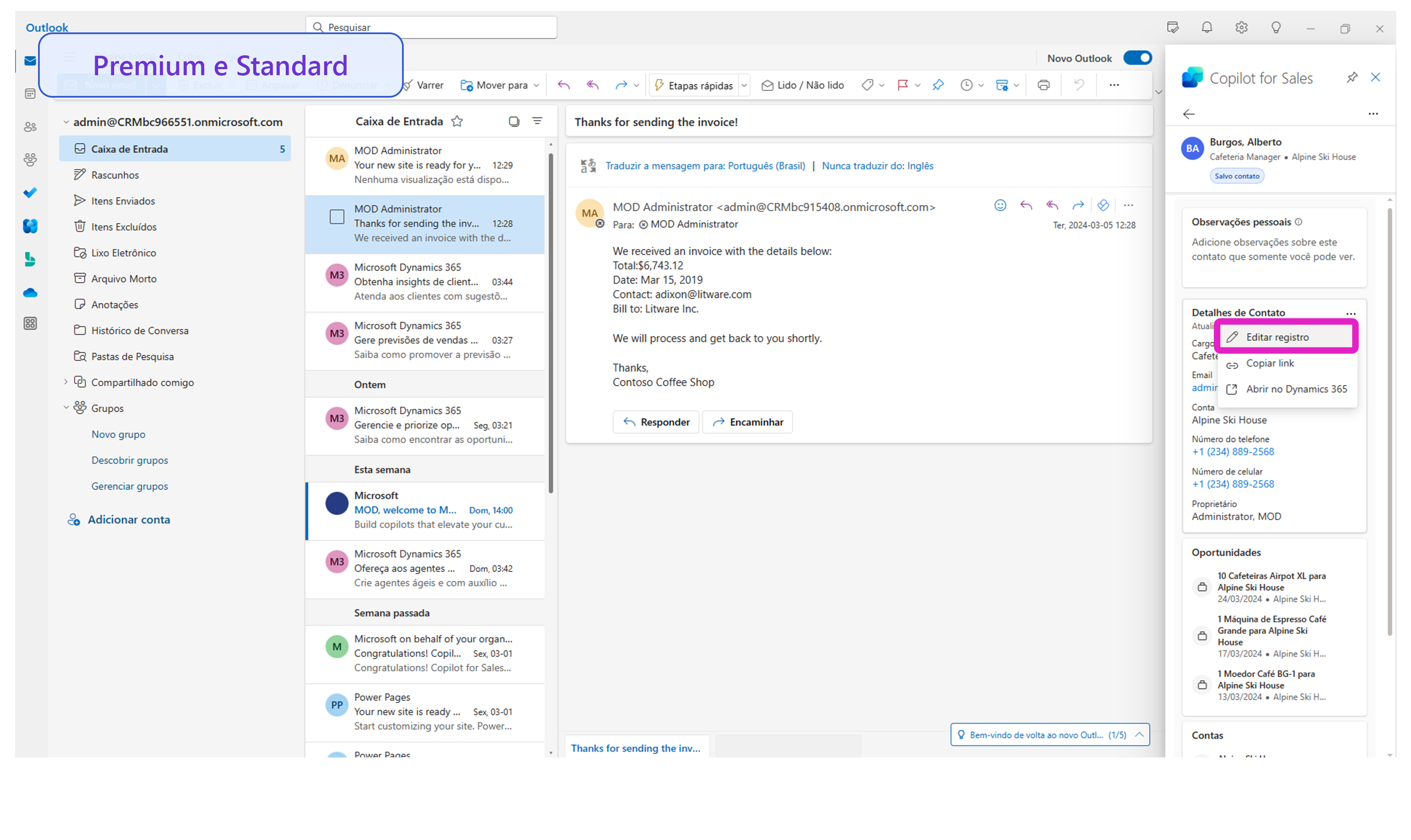 O contexto é sempre fundamental. Com o Copilot para Vendas, os contatos, as oportunidades e os registros de contas relacionados são facilmente acessíveis. As atualizações são claras e descomplicadas; você só precisa selecionar o menu de reticências (...) em um cartão de registro e editá-lo no Outlook.